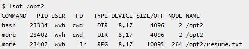 需要终止所有这些进程,然后才能卸载 /opt2 分区。因为这个列表中的进程都不能写任何文件,所以可以使用 kill 命令并指定第二列中列出的进程 ID (PID) 以终止它们,然后就可以顺利地卸载分区。注意,PID 23402 与最后两行相关联 — 第一行表示 more 命令以 /opt2 作为当前工作目录 (cwd),第二行表示 more 命令打开了 /opt2/resume.txt 文件。